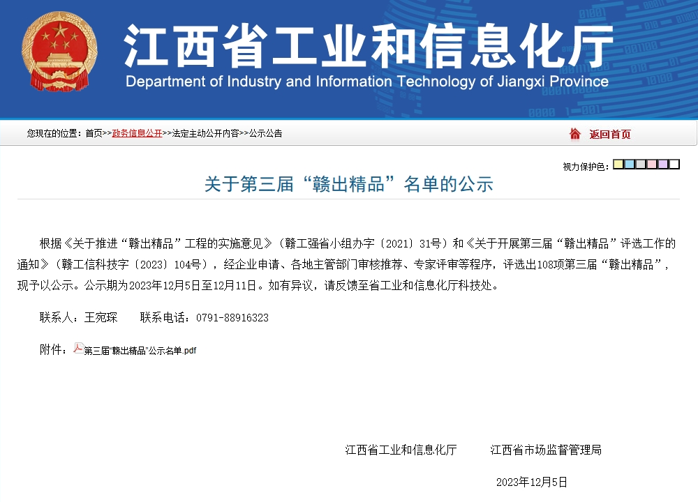 近日,江西省工業(yè)和信息化廳、江西省市場監(jiān)督管理局聯(lián)合公布第三屆“贛出精品”名單。